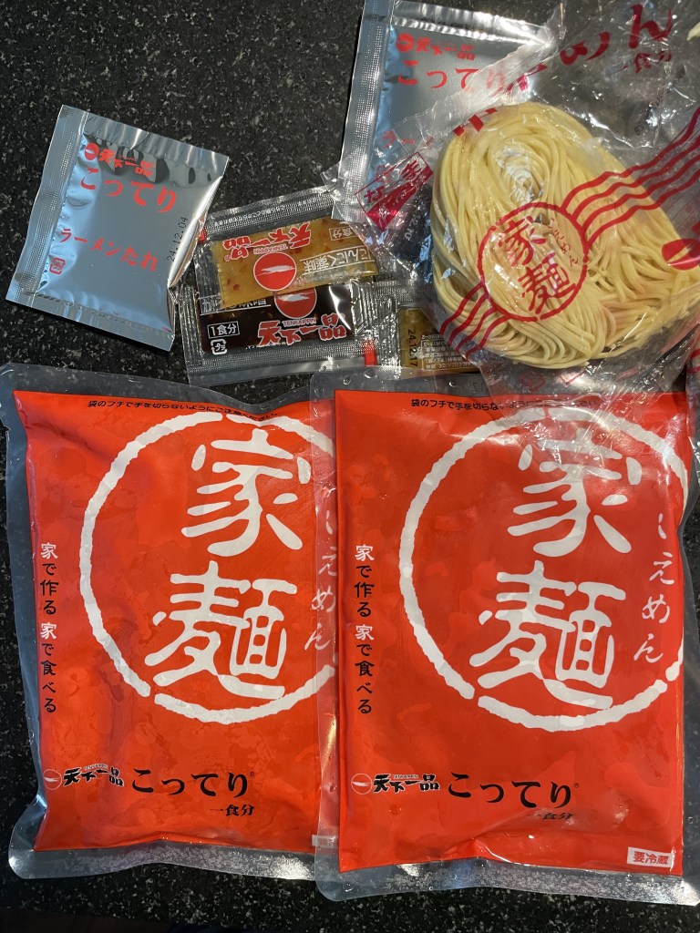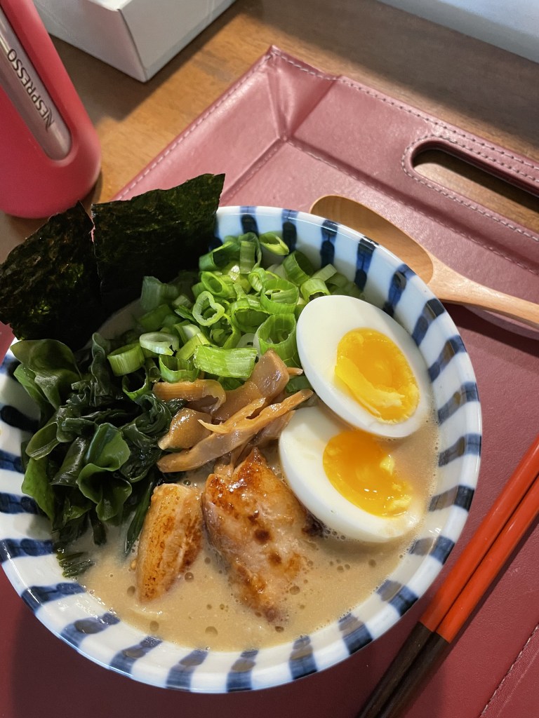 ゆで卵を茹で、わかめをふやかし、ネギを切って、チャーシューがわりの豚バラを炒める。具が全て揃ったら机に並べ、スープを熱々にする。そしてその熱々スープをお椀に注ぐ前に、あとは麺を茹でてお椀に入れるだけの状態に持っていく。アメリカでは手に入らないものなので失敗は許されない。(特に麺)そんな私の緊張感をよそに夫は「そんな難しい顔、しないの」と言った。これでうまくいかなくて1番がっかりするのはキミだろう、と心の中でつぶやく。(天下一品は夫の大好物)