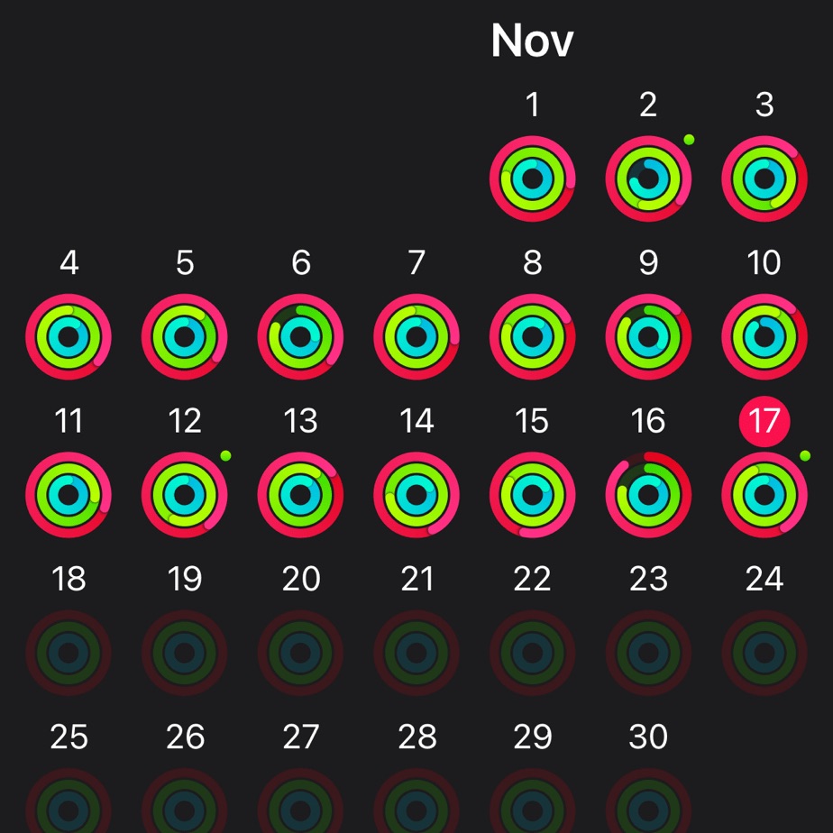 余談、11月の1つの目標がApple WatchのFitnessの赤いリングを全閉じすることだったのだが、この日は夜の寝る直前まで粘りに粘って時計を装着し続けたが、ついに閉じず。無念!しかし目的を見誤ってはならない。健康でいること、そのために必要な休息だったと胸を張って言おう。