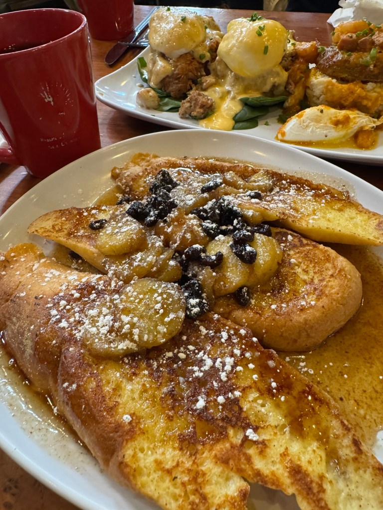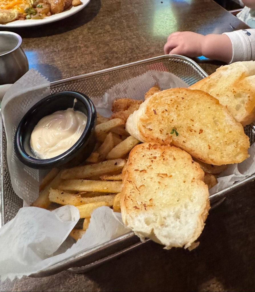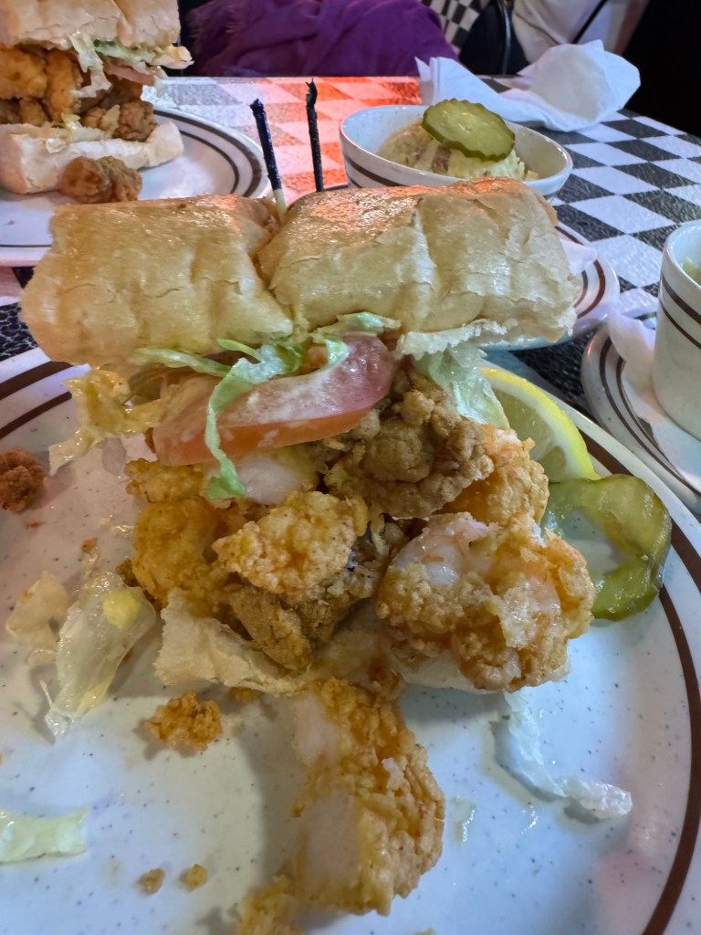 エッ。もはやプレートじゃない。揚げるザルそのままじゃん。朝ごはんじゃなくておつまみじゃん。貴重なニューオーリンズでの一食をアメリカのどこでも食べられる揚げ物に捧げてしまった、と悔しくて泣けた。しかしここは美食の街、ニューオーリンズである。侮るべからず。エビのフライもポテトフライも衣に混ざった塩胡椒の加減が絶妙であった。そしてそして、このストーカーパン、これがまた、適度なガーリック風味にサクフワっとした食感で、とにかくおいしかったのである。