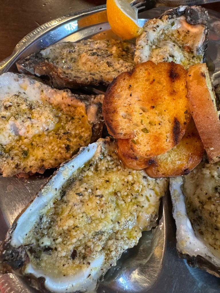 牡蠣の炭火焼き食べ過ぎなのは置いておいて。どんな料理にも、僕を忘れないでね、とばかりについてくるこのパン。こんなでっかいの食べきれないよ!が第一印象であった。が、食べてみるとフワッとサクッと軽いのである。ガーリックトーストにするとそれはもう美味しくて止まらない。パンが吸いに吸った油の量を気にかける自分がいなくもないが、もうそれはどうでも良くなる美味しさなのであった。