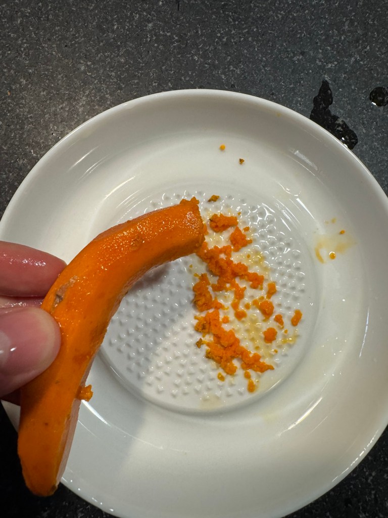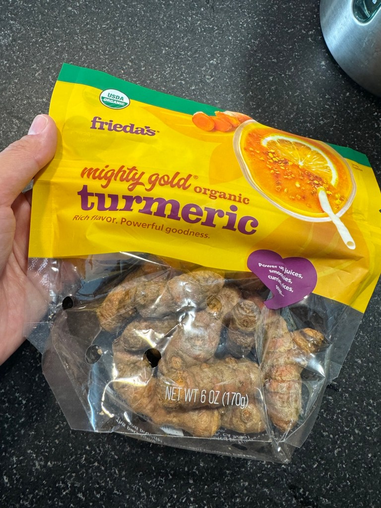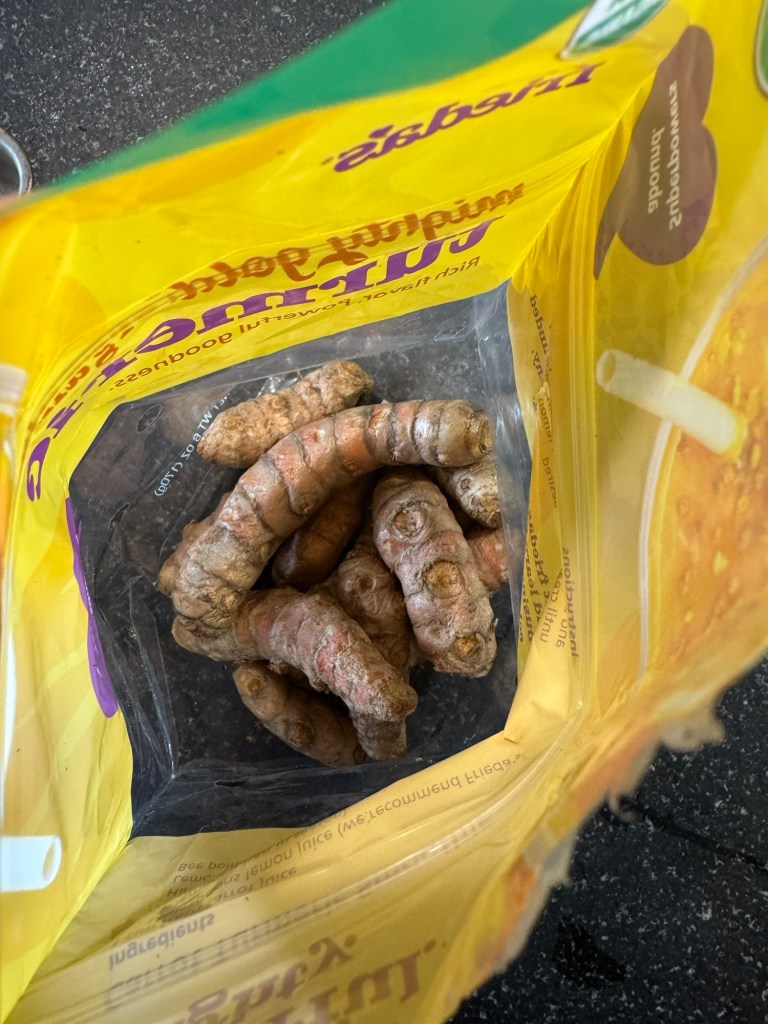 次の日にドライカレーを控えたある日、近所のトレジョーで、生ターメリック(和名、ウコン)が光り輝いていた。初めて見た。これが生のターメリックか、とスパイス好きな自分、棚の前で立ち止まり、じッと考える。買いたい。でも、確実に干からびさせる未来が、やめておけ、と言う。そうなのだ、たくさんの食べ物をダメにしてきた自分にはもうたくさんなのである。フードロス削減に1番大切なこと、それは衝動買いしないことなのである。そしてわたしはその未来さんに従い、グッと欲を腹の底に押し込み、その場を去った。だが腹の底の欲は諦めなかった。ブログのネタとして使い切れる未来〜を提示してきたのだった。そしてわたしは滑らかなUターンで生ターメリック売り場へと戻り、それを一袋カートに入れた。