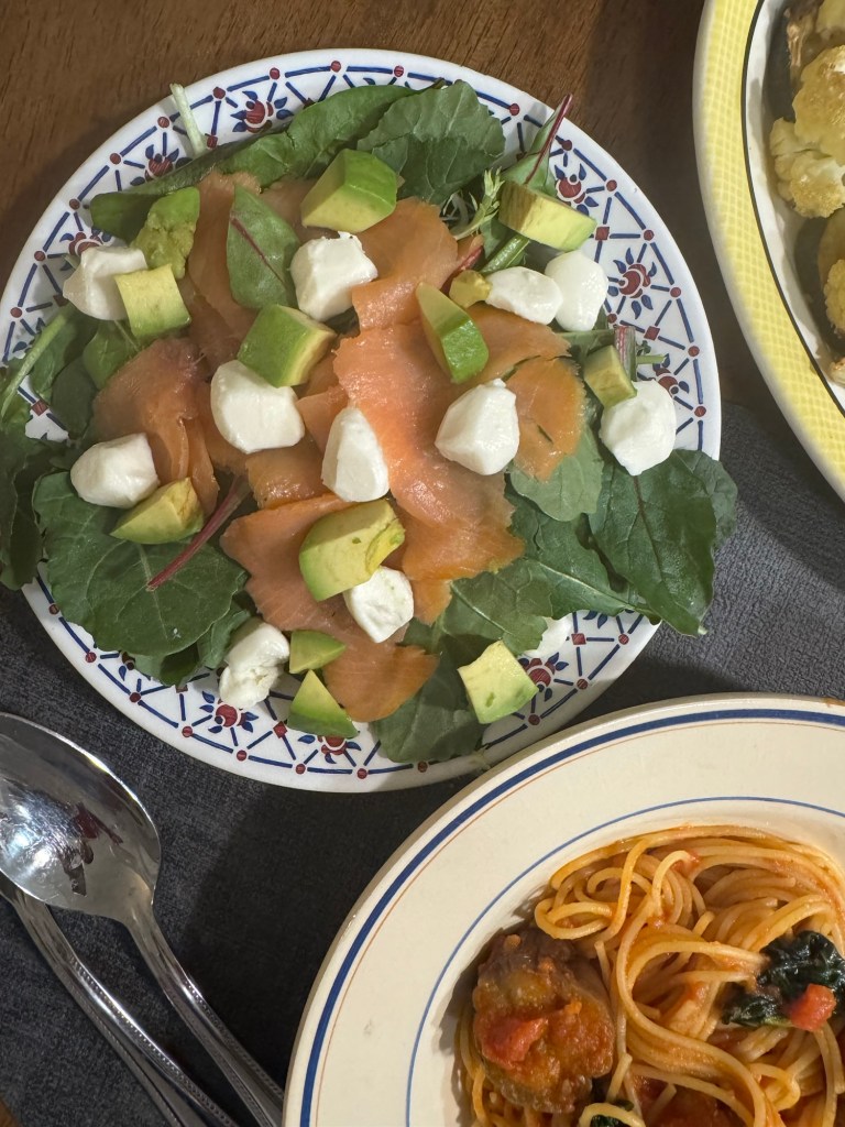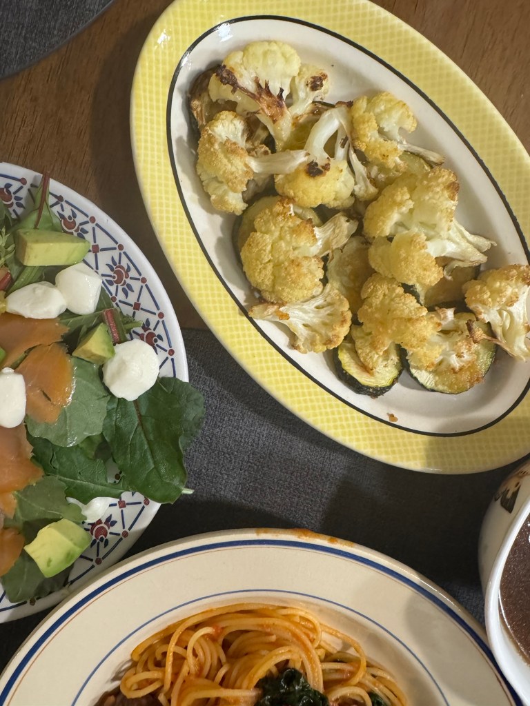 そうしたら、「今日はご馳走だね」と夫が言った。おおお恐るべし盛り付けの力。パチパチ。ただ盛り付けただけのサラダと、オーブンで焼いただけの野菜と、簡単なトマトパスタだったのに。シンプルで、手間もかけすぎず、満足度の高いごはんを作ることができたことへの高揚感がすごかったァ。