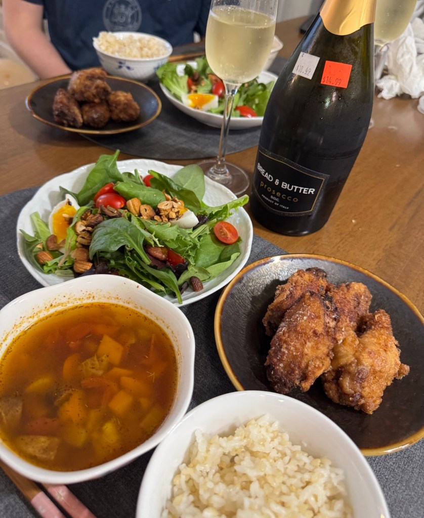 ちなみに親のごはんはこちら。主役は童なので、至って普通。醤油などに漬けておいたチキンウィングをせめて揚げた。あと、スパークリングワインを。(お値引き品)遠慮せずゴクゴク飲めて大満足〜。たまにはこういうのもいいね。