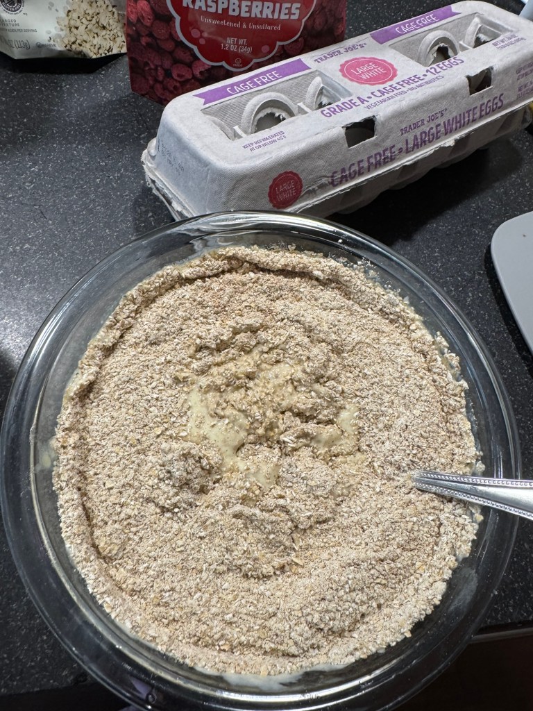洗いものケチって小さいボウルで作るとハラハラするよ。この粉っぽいものはオートミールと栄養豊富なヘンプシード(大麻草)をフープロで砕いたもの。