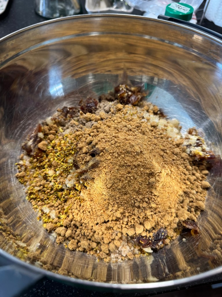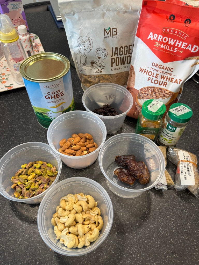 材料はこんな感じ。全粒粉にギー、お好みのナッツ、お好みのドライフルーツ、カルダモンパウダー、ターメリック、エディブルガム、ポピーシード、ジャグリーパウダー。