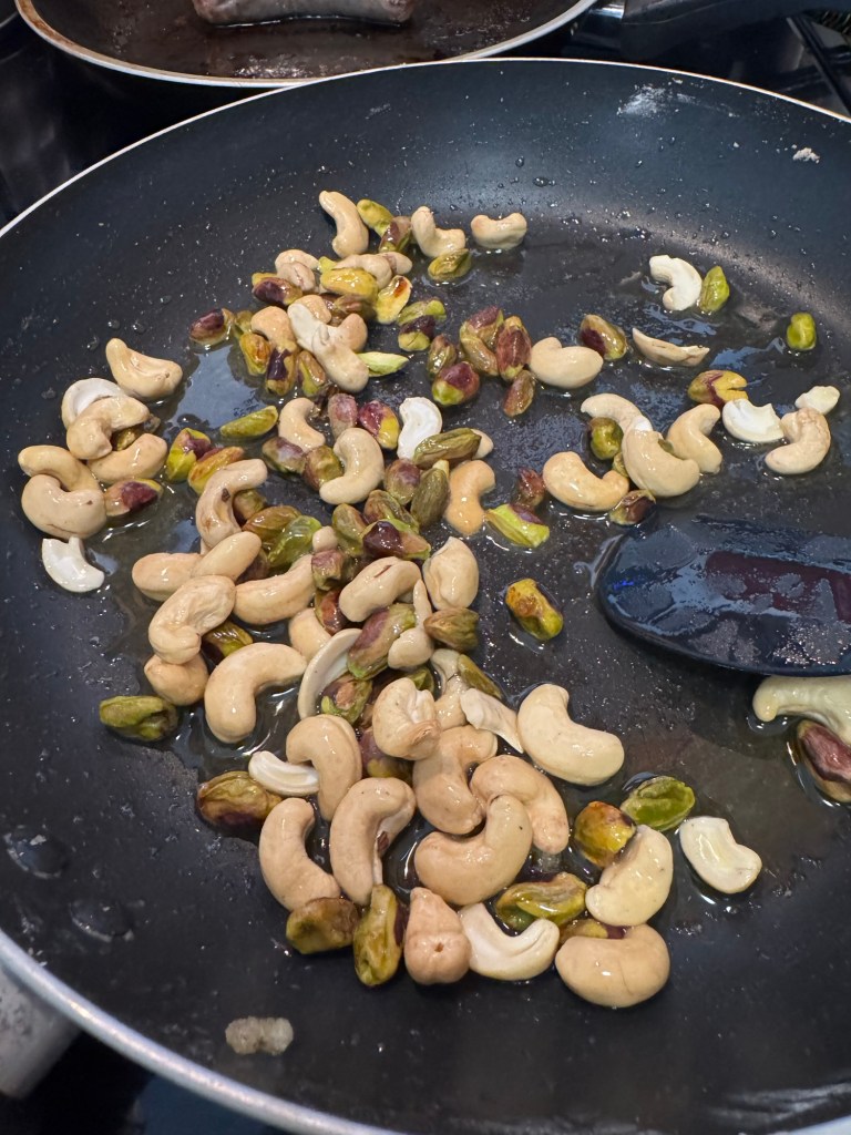 材料が揃ったら、あとはそれぞれをギーで炒めて、ナッツ類をミキサーで砕いて、混ぜて、丸めるだけ。時間はかかるけれどシンプルなレシピだよ。