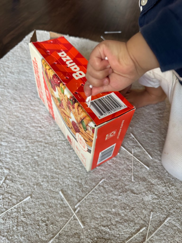 友人のモッタイナイ精神がすごい。別部屋で子どもたちと遊んで戻ってきたら、はいよっとさっき食べたパスタの空箱に穴を開けて綿棒を落とすというおもちゃが出来上がっていた。