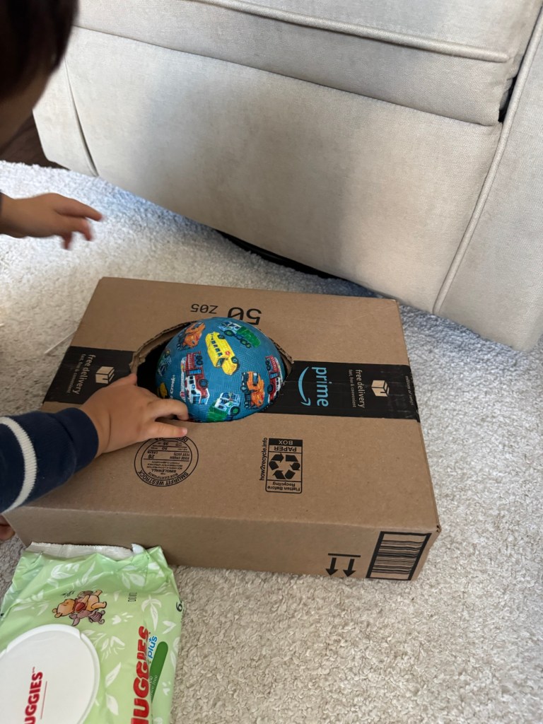ただ、穴を開けた。それでも気分がいい。綿棒パスタ箱にはかなわないけれど、息子もボール運んだり、破った紙をポイポイしたり、それなりに遊んでくれている。息子に踏まれてボロボロになっても、ただゴミ箱に行くはずだったものがこうにも新しい役割を与えられて、その姿は活き活きとしていた。